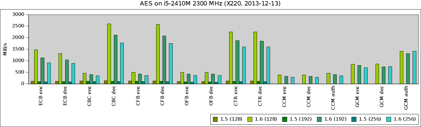 To check how 1.6.0 will compare to the older 1.5 version of Libgcrypt, I did some benchmarks using a Thinkpad X220 which features an i5-2410M processor at 2.3GHz running a 64 bit Debian Wheezy. Default compiler options have been used.